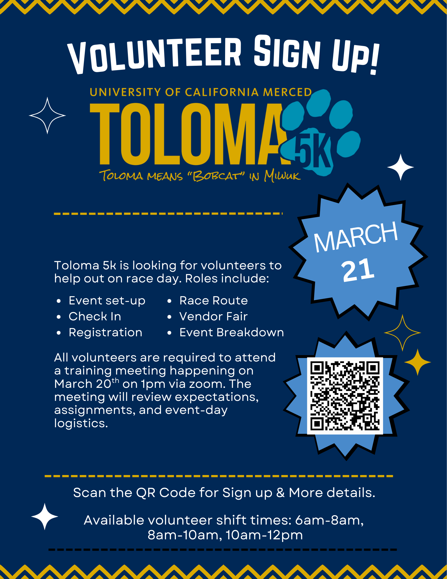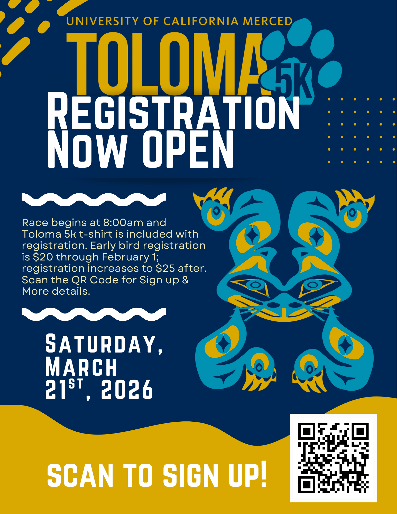 Check out our FAQ page for more information or email Race Director Lorena Mejia (lmejia35@ucmerced.edu).