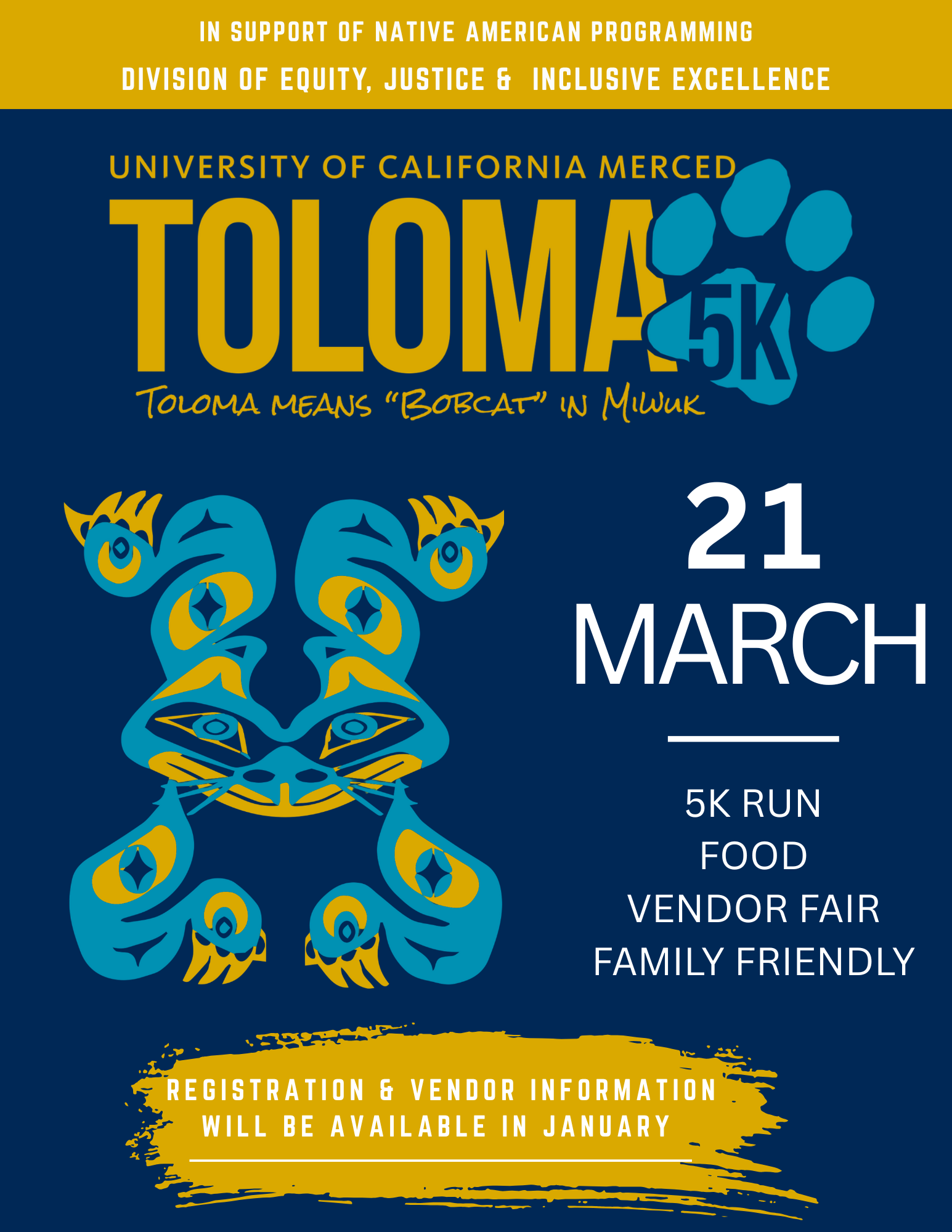 EJIE co-sponsors an annual 5K run in recognition of the tradition among indigenous tribe of California to engage in distance running for the purpose of communication and competition. Members of local tribes and residents of the greater Merced community are invited to participate and run through a campus course that includes passing beneath the "Beginnings" sculpture, crossing over the Scholars Bridge, and passing by the Toloma Grove Native acknowledgement and reflection area. Monies raised are directed to the support of Native American student scholarships and programming