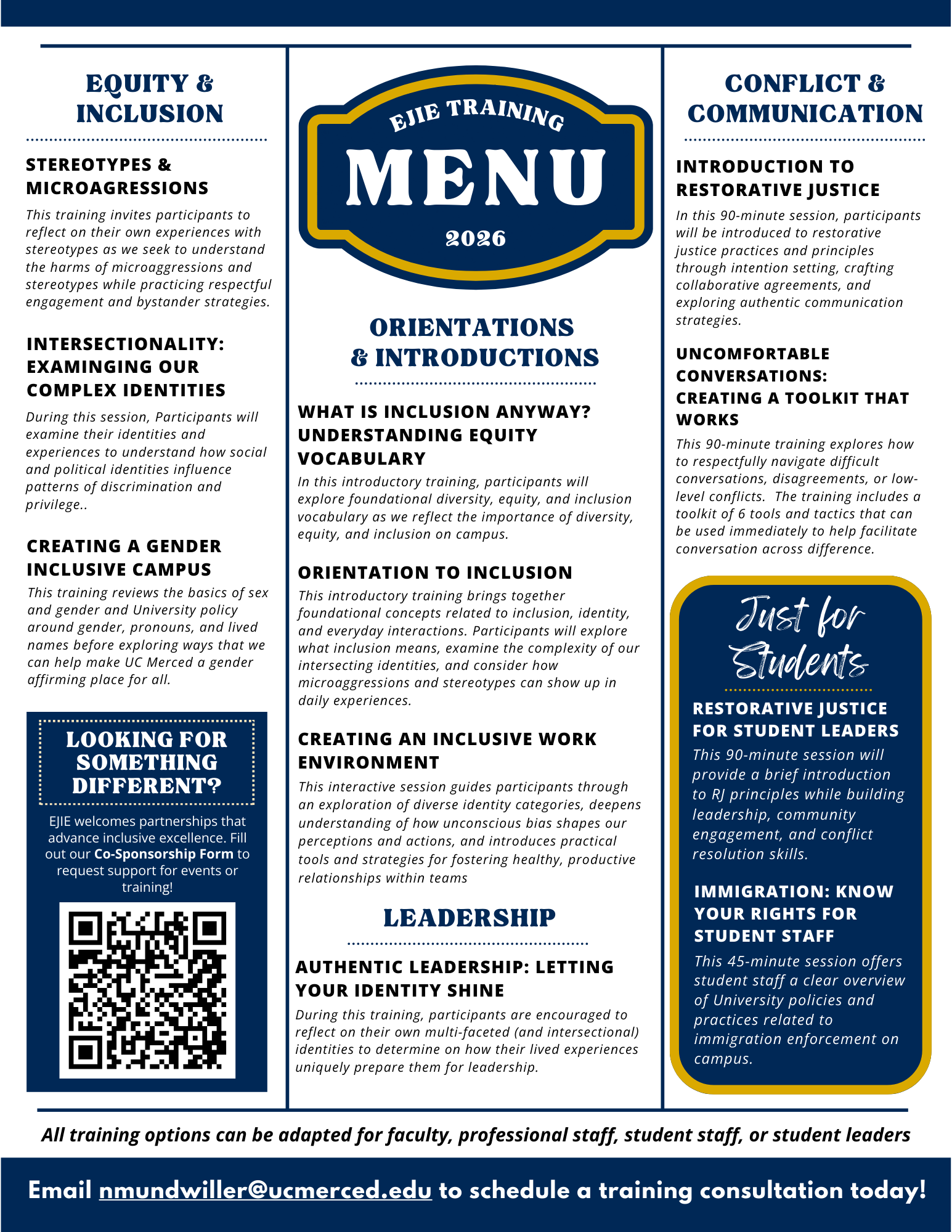 At EJIE, we understand that each campus department has its own unique goals, challenges, and areas for growth. That's why we offer customized trainings designed to meet the specific needs of your team or department. We collaborate closely with campus departments to develop training on a variety of topics. To request a training, please email our Training Specialist Nick Mundwiller at nmundwiller@ucmerced.edu.